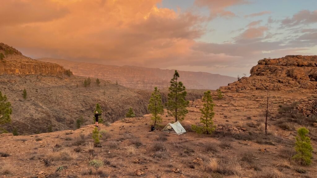 Die Abendstimmung auf Gran Canaria war ganz besonders. Die leuchtenden Farben der Dämmerung oder das orangerote Abendlicht des Tals waren teilweise surreal. Doch so beeindruckend diese Momente waren, so herausfordernd war oft die Suche nach einem passenden Spot für die Nacht. Steile Hänge und exponierte Lagen machten die Auswahl nicht leicht. Trotzdem fanden wir am Ende immer einen Spot – manchmal spektakulär gelegen, mit weitem Blick über die Berge und manchmal auch etwas unkonventionell zwischen verrußten Sträuchern des letzten Waldbrandes. Vor allem der Wind hat uns und unser Zpack Triplex Zelt ganz schön gefordert und auch mal eine schlaflose Nacht bereitet. Entlang der Wanderwege gibt es übrigens auch einige offizielle Campingbereiche mit Wasserstellen und vereinzelt sogar Toiletten. Das war zwischendurch eine willkommene Abwechslung.