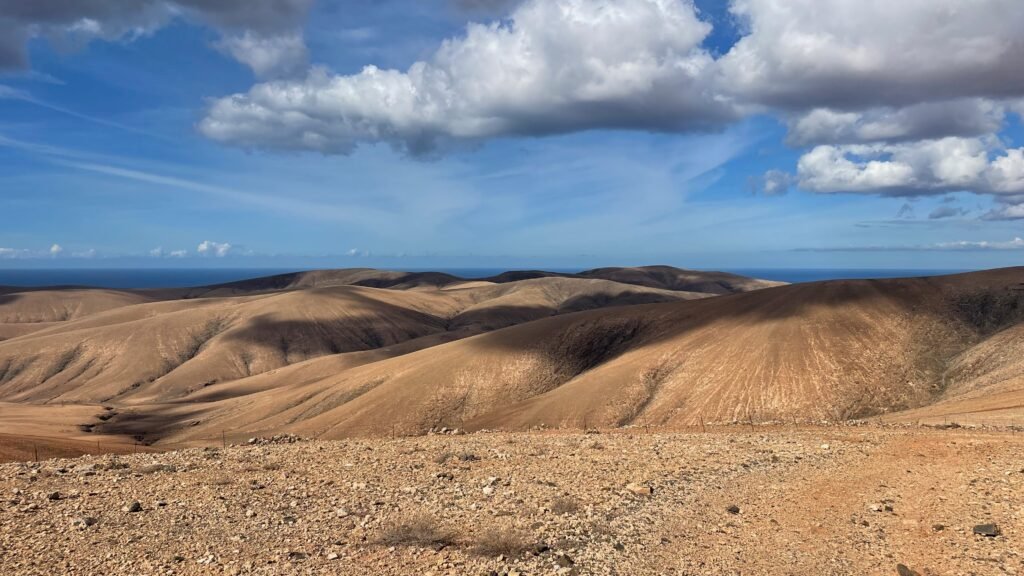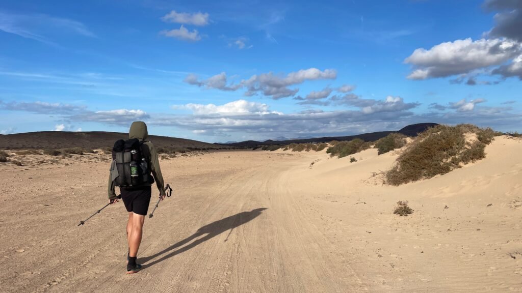 Fuerteventura ist anders und erinnert uns an einen Wüstenplanet. Es ist heiß, sandig und windig. Gestartet sind wir in Morro Jable im Süden der Insel. Das Ziel war Corralejo. In 6 Tagen haben wir die Insel zumeist auf dem GR131 durchquert. Inspiriert von Stefan Berger haben wir einen Teil der Strecke ans Meer verlegt. Der Originalweg würde abgesehen von den ersten Kilometern hauptsächlich durch das Landesinnere verlaufen. Wir haben zwar keinen Vergleich, fanden die gewählte Strecke aber sehr schön. Höhenmeter gibt es deutlich weniger als auf den anderen beiden Inseln. Die Herausforderung liegt hier mehr in der unendlichen Weite.