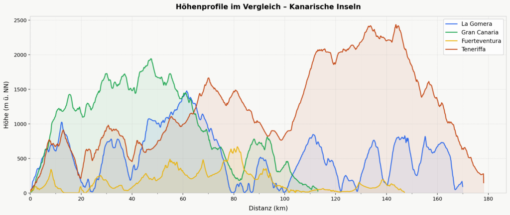 Höhenprofil im Vergleich: La Gomera, Gran Canaria, Fuerteventura, Teneriffa